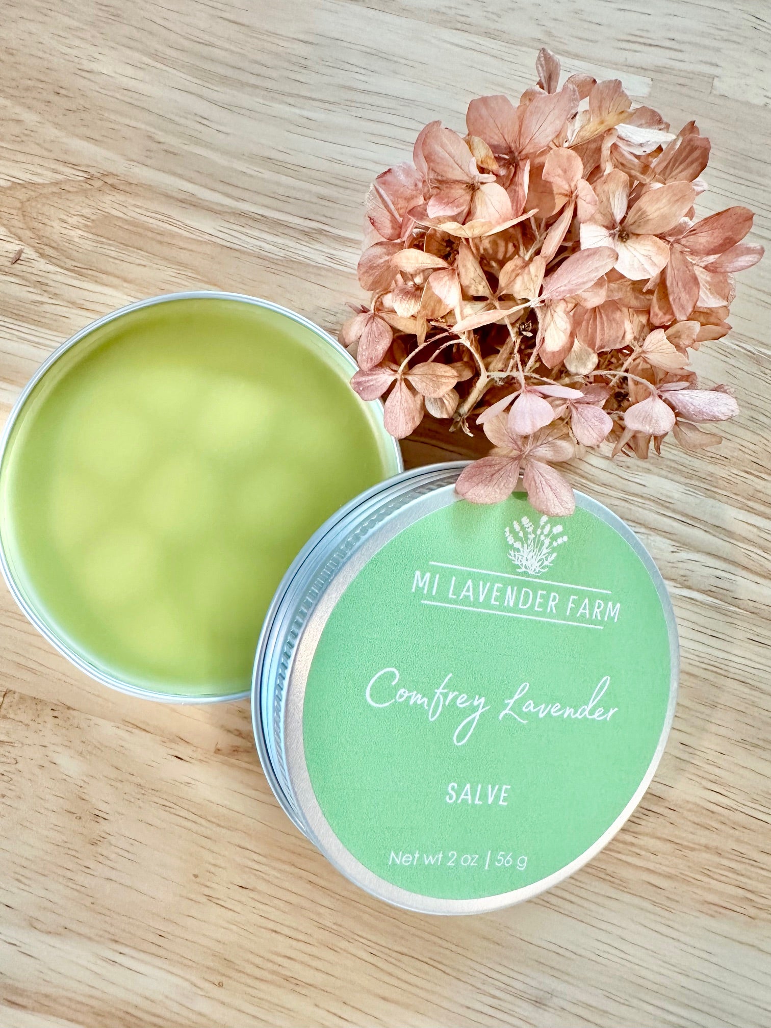 Our Comfrey Lavender Salve is a soothing, all-natural balm designed to support your skin’s healing process. Handcrafted with comfrey, known for its traditional use in easing minor cuts, scrapes, bruises, and dry patches, as well as muscle and joint aches and pains, this salve is enhanced with calming lavender to promote relaxation while nourishing your skin. Rich in natural oils and beeswax, it creates a protective barrier that locks in moisture without harsh chemicals or synthetic fragrances.